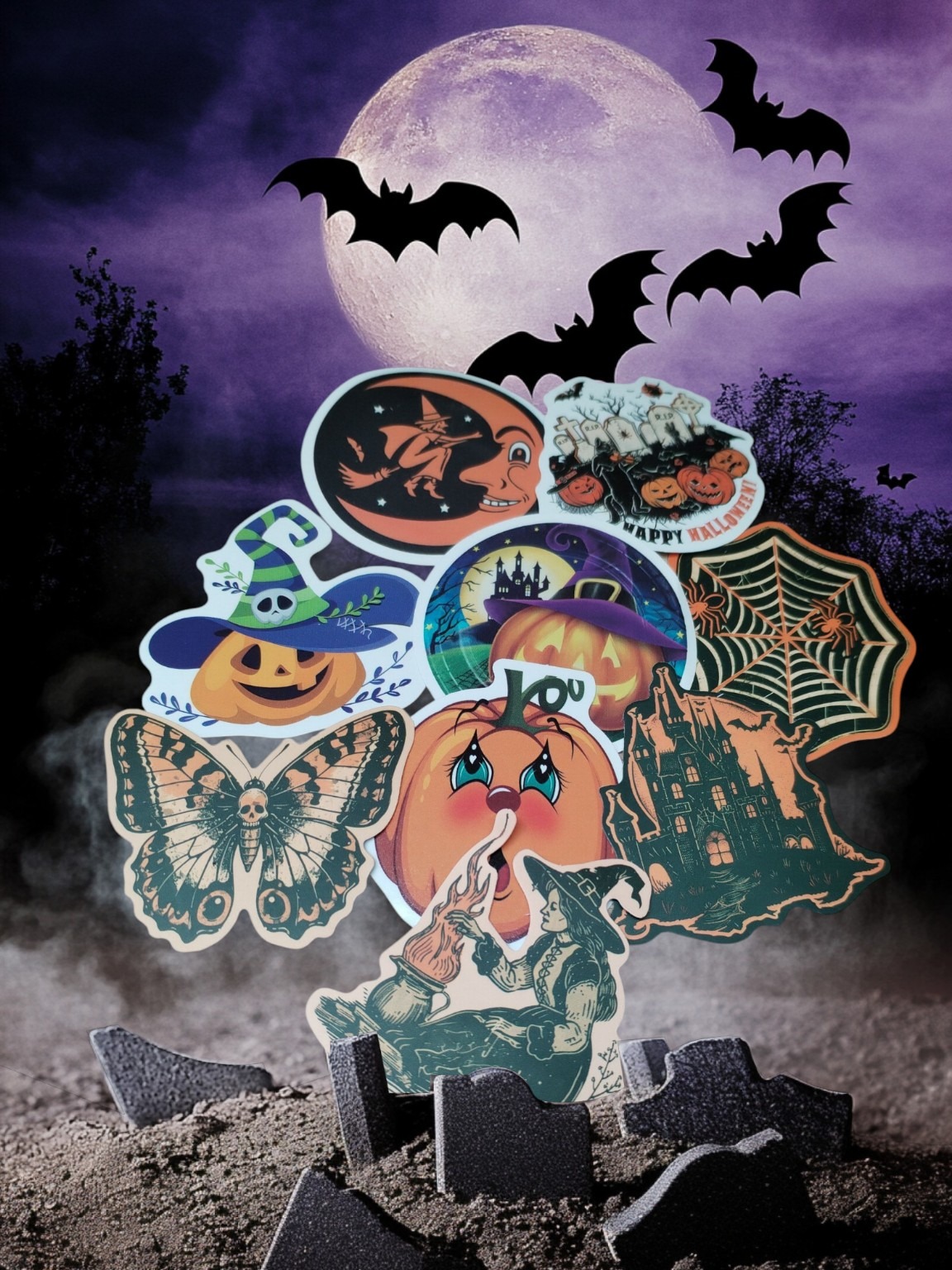 Die Motive reichen von klassischen Kürbissen und Hexenhüten bis zu Vintage-Halloween-Designs – perfekt für dein Journal, Scrapbook oder als Deko.