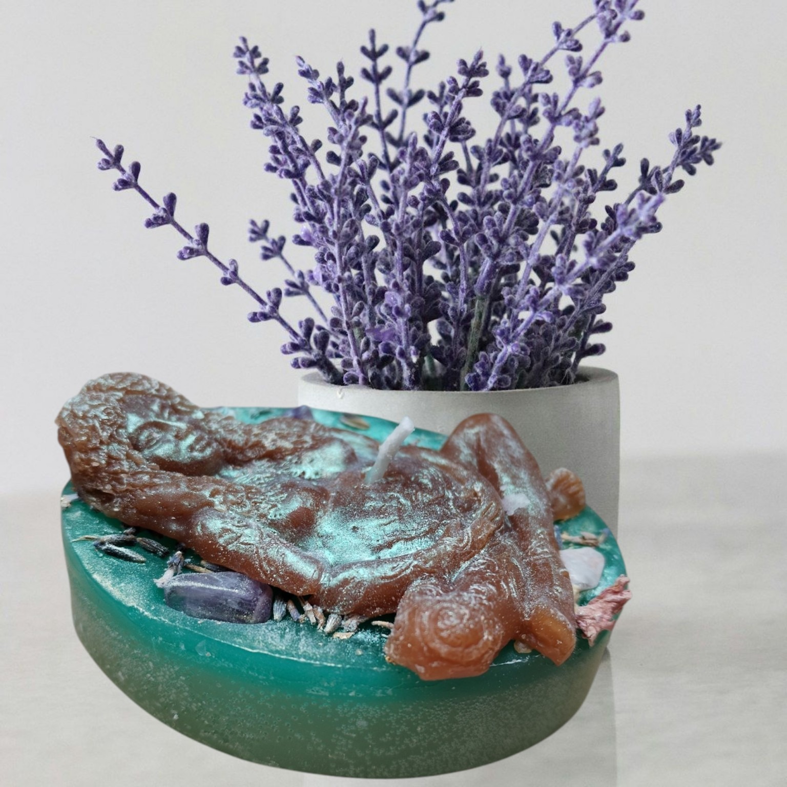 Zwei liebevoll von Hand gegossene Figurkerzen, inspiriert von Mutter Gaia – Symbol für Natur, Leben und Geborgenheit.
