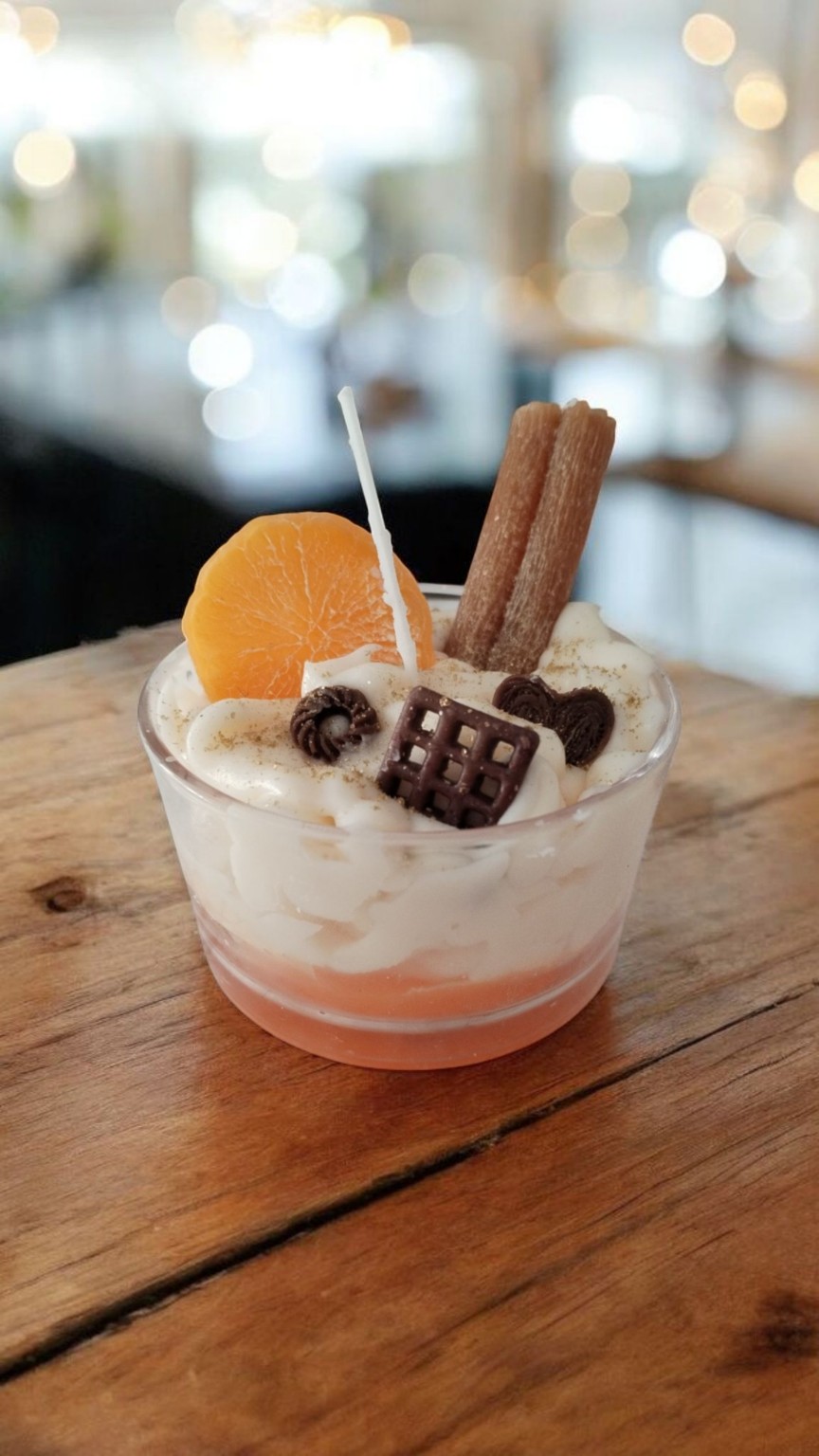Die gesamte Dekoration – von der cremigen „Sahne“-Optik über die Zimtstange bis zur Orangenscheibe und den kleinen Schokoladendetails – besteht vollständig aus Wachs.